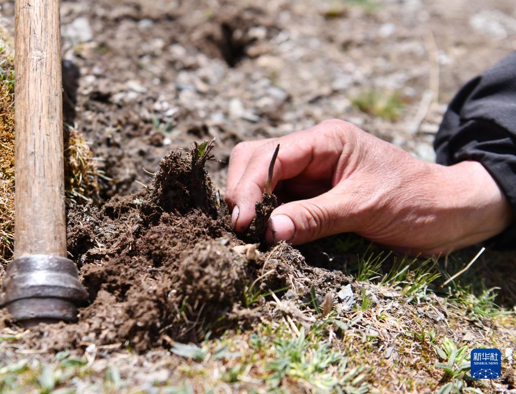 沿着陡峭山坡,攀至海拔超过4700米的地方,才能来到冬虫夏草藏身的草甸。一条腿弯曲、一条腿伸直、手肘支撑、俯身低头,高原上的村民就这样以拥抱大地的姿态,搜寻着隐藏其中的暗棕色芽尖——冬虫夏草。刚刚将虫草挖出,采挖虫草的牧民就拿起锄头用钝头轻敲地面,把掀开的土壤回填到原位——他们用这样简单而朴实的方式保护着大自然的馈赠,为来年冬虫夏草的生长打好基础。
