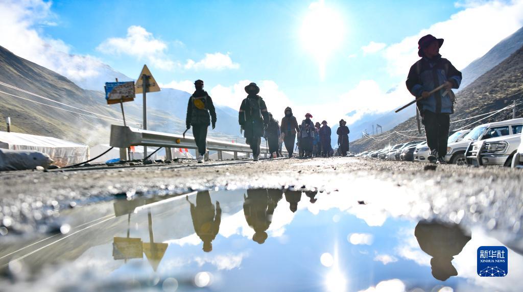 清晨,西藏那曲市比如县良曲乡然木塘村虫草采集点的人们统一前往山上采集虫草(5月26日摄)。