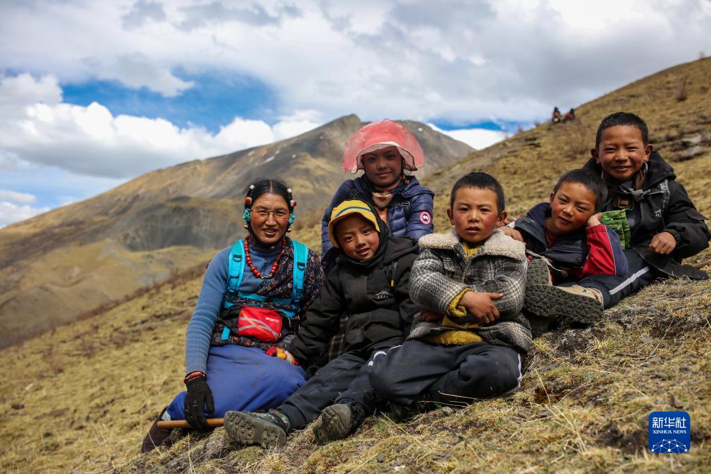 牧民其美嘎德(左一)在虫草采挖间隙和当地一些孩子在一起(5月25日摄)。