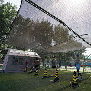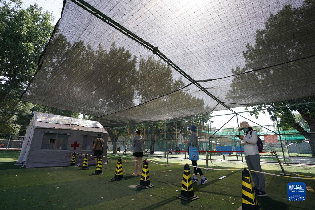 北京连日来持续高温。在北京市东城区体育馆路街道各核酸检测点位,街道和社区工作人员、志愿者、医护人员在高温下坚守防疫一线。为了保障高温下核酸检测点位高效、有序运转,体育馆路街道及时为医护人员、志愿者和居民配备冰块、电风扇、遮阳棚等防暑降温的设备设施。