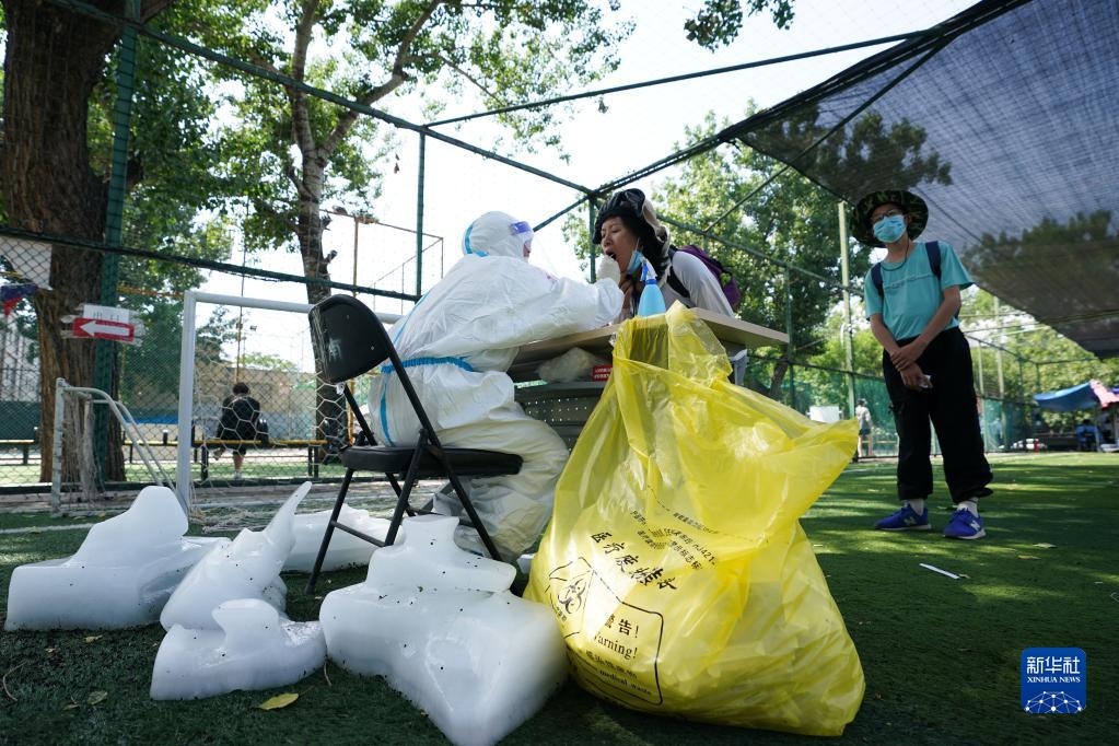 5月28日,在北京市东城区体育馆路街道四块玉社区一处核酸采样点,来自北京华都中医医院的医护人员在为居民采样,她的脚下摆放了用于降温消暑的冰块。