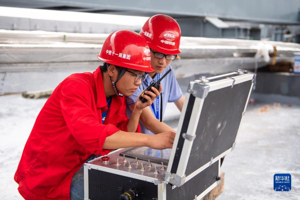 5月29日,在长沙磁浮东延线接入T3航站楼工程道岔梁顶推现场,工作人员正在操作顶推设备。