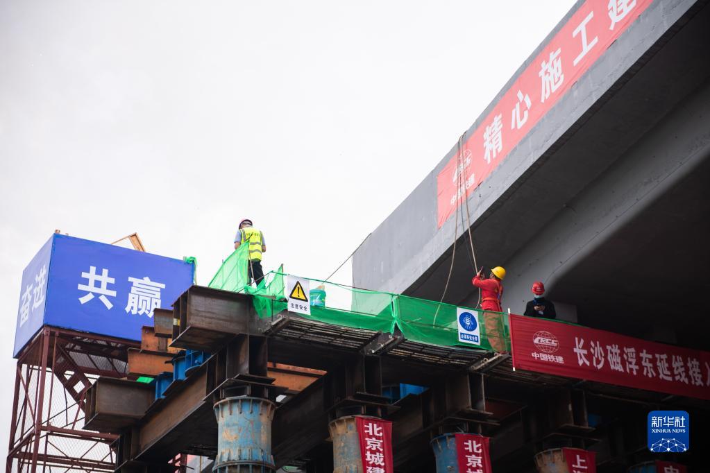 5月29日,长沙磁浮东延线接入T3航站楼工程道岔梁顶推现场,工作人员在施工。新华社记者 陈思汗 摄