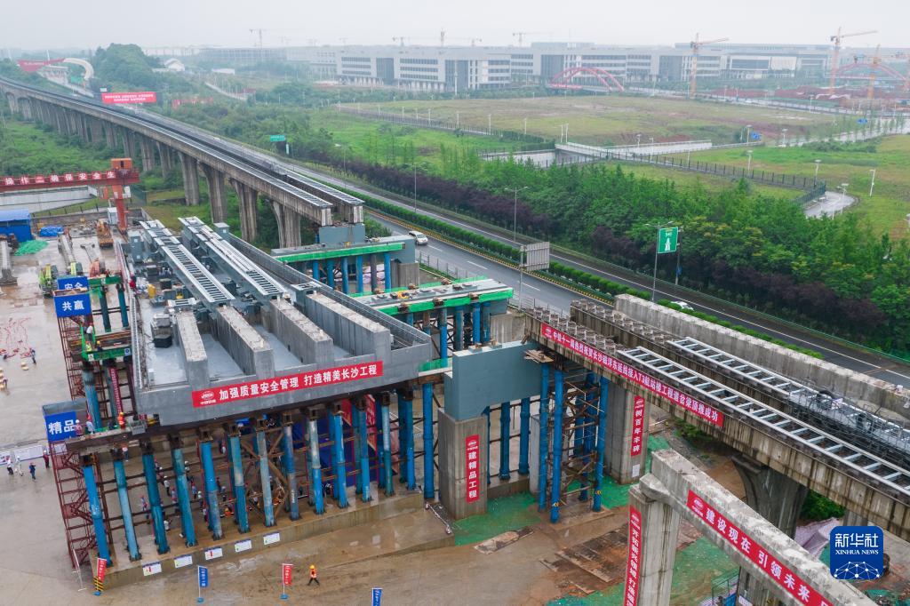 5月29日,长沙磁浮东延线接入T3航站楼工程道岔梁顶推启动(无人机照片)。新华社记者 陈思汗 摄