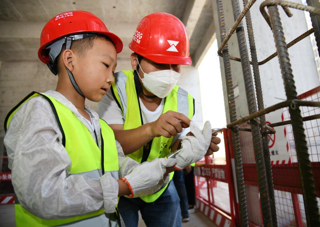 5月28日,在专业人员的指导下,小朋友在施工现场学习钢筋绑扎。