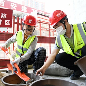 5月28日,在专业人员的指导下,小朋友在施工现场体验砌砖。
