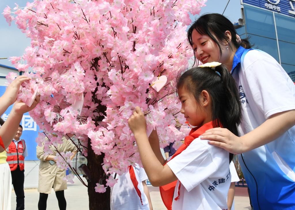 5月29日,中铁建工白沙湾足球基地项目工地,一名小女孩在“知心姐姐”陪护下系上自己的“微心愿”。