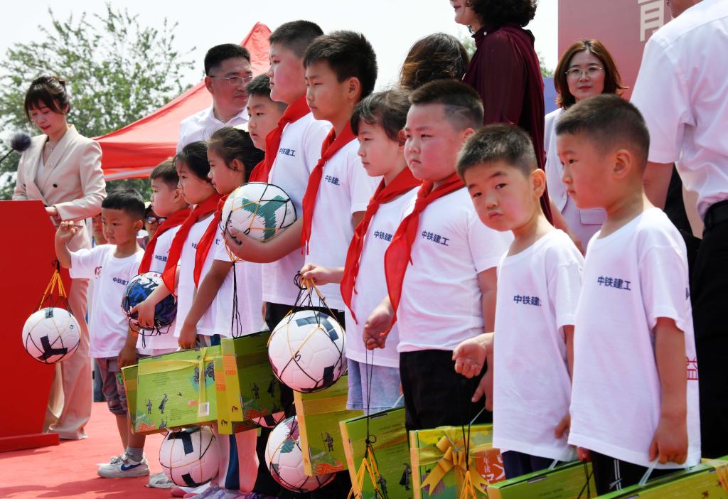 5月29日,中铁建工白沙湾足球基地项目工地,孩子们收到节日礼物。