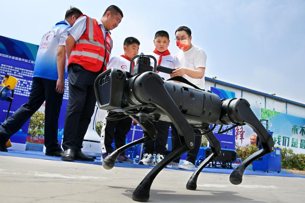 5月29日,中铁建工白沙湾足球基地项目工地,孩子们在体验智能机器狗。