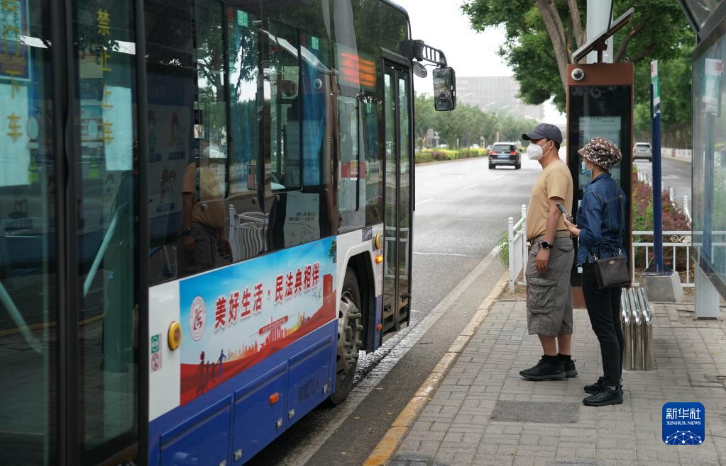 5月29日,在北京市顺义区一公交站,市民准备乘坐公交车。