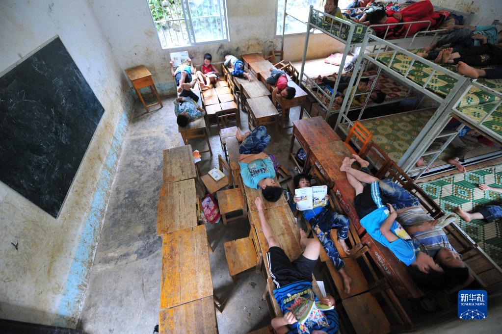 在弄勇小学,同学们在教室里的课桌和床架上午睡(2014年7月2日摄)。当时,学校的宿舍楼正在建设中。