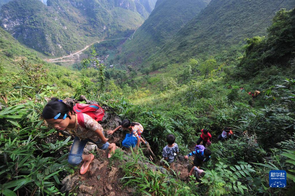 在弄勇村弄顶屯,三年级学生蓝春香(左二)爬山路去上学(2012年9月3日摄)。今年6月,在大化瑶族自治县高级中学读书的蓝春香即将参加高考。