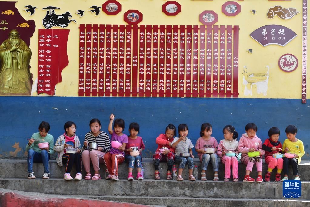 弄勇小学学生在吃营养午餐(2019年11月11日摄)。