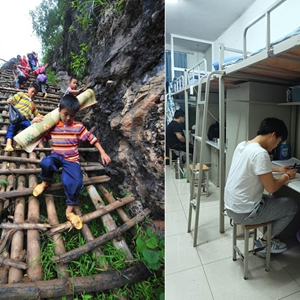 拼版照片:上图为弄勇小学学生蒙承权(左一)、蒙旺兵(左四)和同学在校园外的公路上玩耍(2012年7月4日摄);下图为即将参加高考的高三学生蒙承权(左一)、蒙旺兵(左二)在大化瑶族自治县高级中学校园里合影(2022年5月24日摄)。