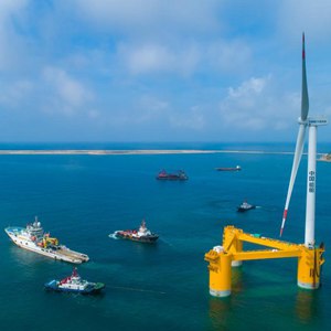 由中国船舶集团海装风电股份有限公司牵头,联合相关单位自主研制的“扶摇号”浮式风电机组浮体平台上配备6.2兆瓦抗台型I类风力发电机组,在深远海应用场将依靠九个对称分布的悬锚链系泊实现固定。