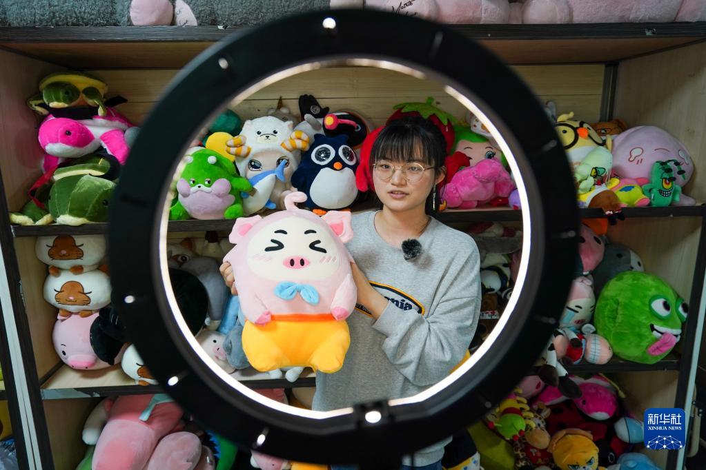 在扬州市邗江区西湖街道金槐村的一家毛绒玩具加工企业,工作人员通过网络直播介绍推销毛绒玩具(5月26日摄)。