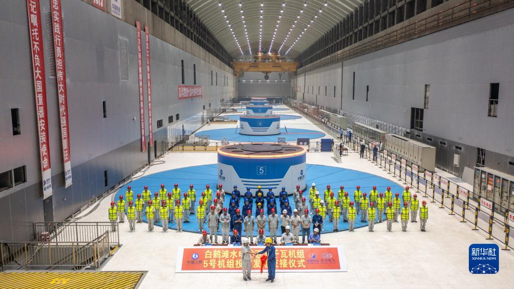 5月30日拍摄的白鹤滩水电站5号机组投产发电交接仪式现场。