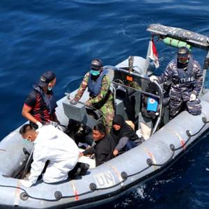 这张印度尼西亚国家搜救局提供的照片显示,5月29日,部分落水人员在南苏拉威西省附近海域获救后乘坐印尼海军橡皮艇。