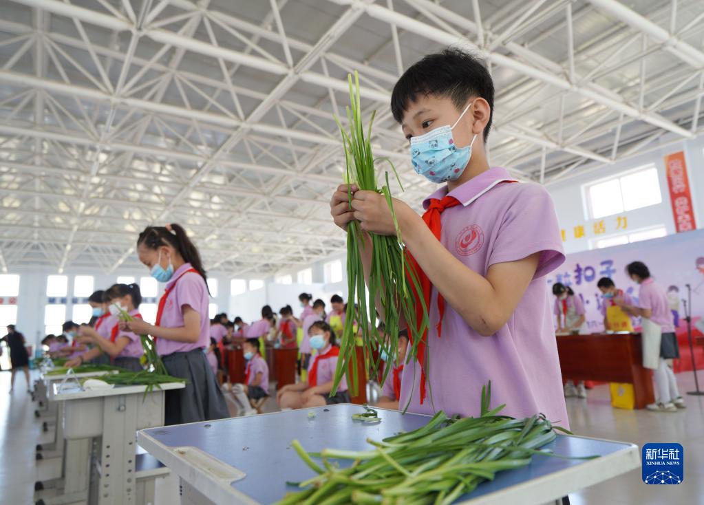 5月30日,河北省内丘县大良村小学学生在参加择菜比赛。