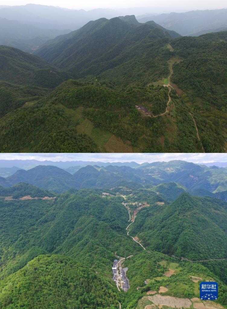 拼版照片:上图为2016年9月22日拍摄的李国芝位于山顶的老房子及他自己挖出的下山路(无人机照片);下图为2022年5月12日拍摄的李国芝现在居住的易地扶贫搬迁安置点及通往安置点的硬化道路(无人机照片)。