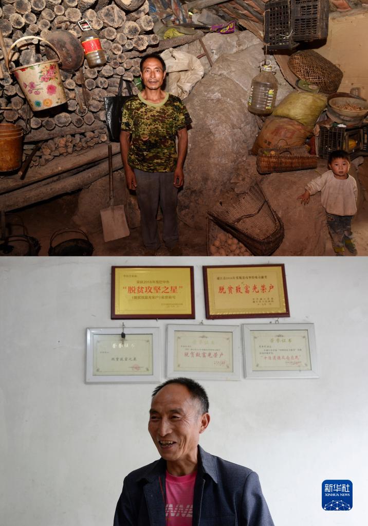 拼版照片:上图为2016年8月22日,李国芝和儿子在老房子里合影;下图为2022年5月12日,李国芝与新房墙上他获得的各种脱贫攻坚先进表彰奖状合影。