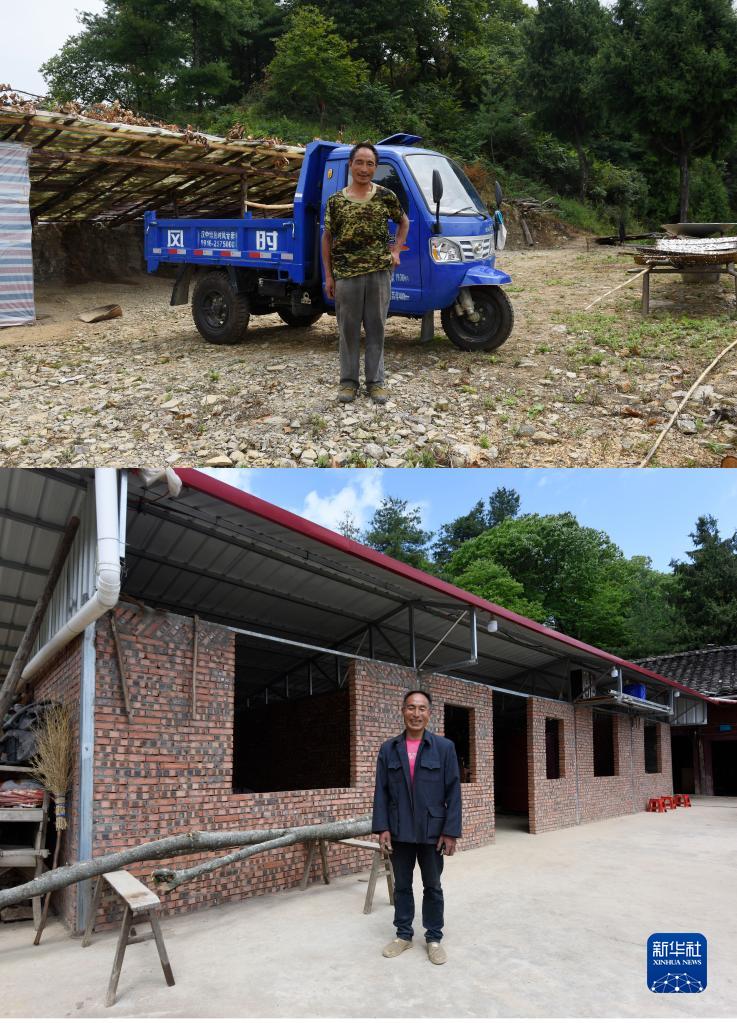 拼版照片:上图为2016年8月22日,李国芝在他搭建的草棚前留影;下图为2022年5月12日,李国芝在同一位置留影。身后的草棚已拆除,今年他花两万元在原址修建了储粮仓库。