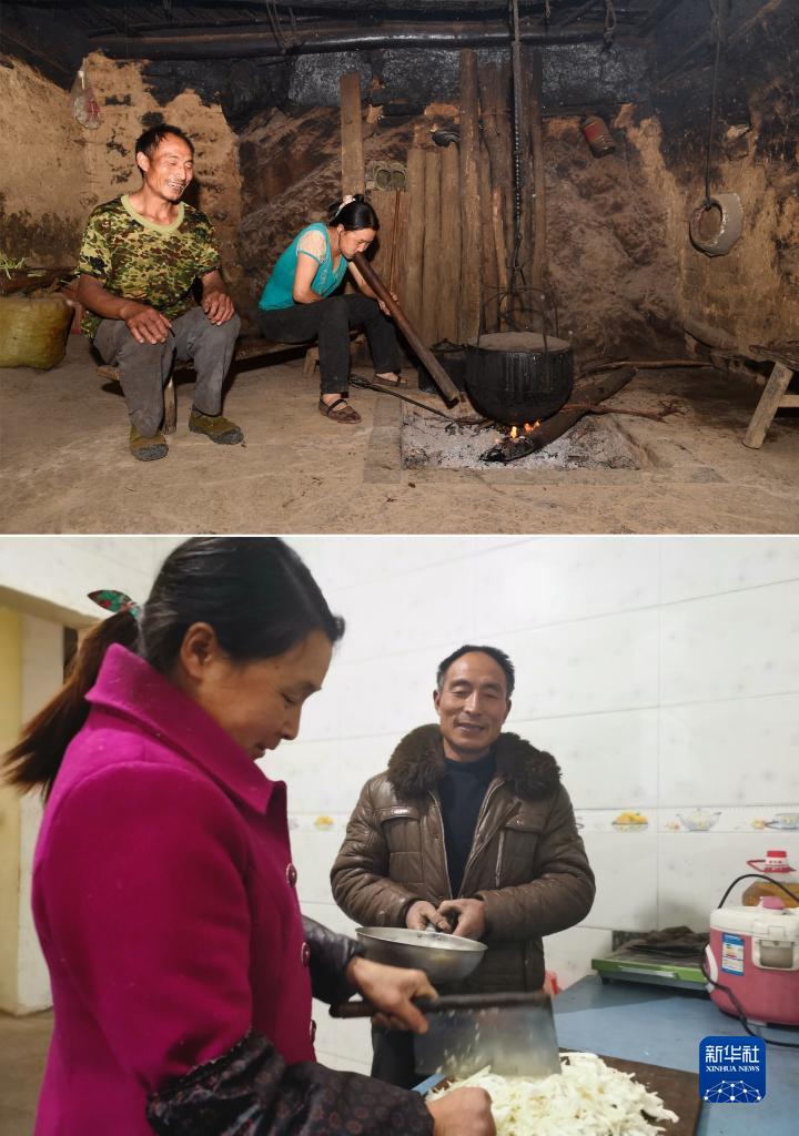 拼版照片:上图为2016年8月22日,李国芝夫妇在老房子中生火做饭(新华社记者刘坤摄);下图为2020年11月,李国芝夫妇在新房中做饭(新华社发)。