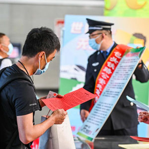 在第35个“世界无烟日”来临之际,包头铁路公安处在管内车站、列车开展系列宣传活动。通过展板图例讲解、发放知识手册、真实案例警示等多种形式,向广大旅客讲明吸烟对身体健康的严重损害和对自然环境的巨大威胁,解读在火车站、动车组列车上禁止吸烟的法律法规,动员旅客群众自觉不吸烟、主动戒烟,践行文明健康绿色环保生活方式。新华社记者 王泽聪 摄