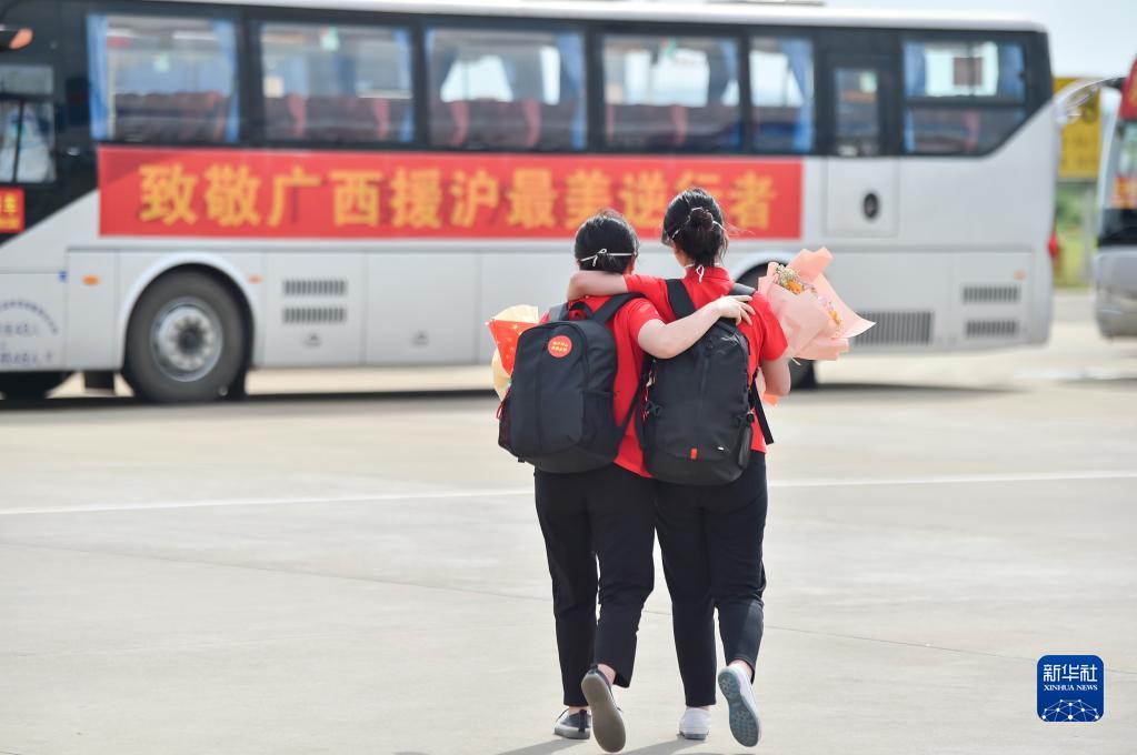 5月30日,在广西南宁吴圩国际机场,两名广西援沪医疗队队员一起走向接驳的大巴车。