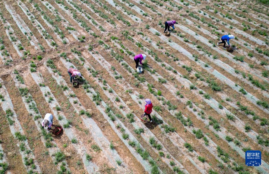5月30日,采茶工在宁夏中卫市中宁县新堡镇吴桥村枸杞芽茶基地采摘枸杞芽茶(无人机照片)。