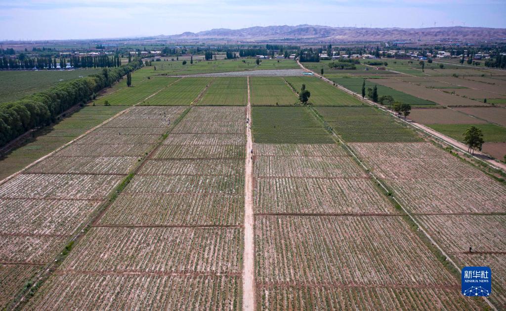这是5月30日拍摄的宁夏中卫市中宁县新堡镇吴桥村枸杞芽茶基地(无人机照片)。