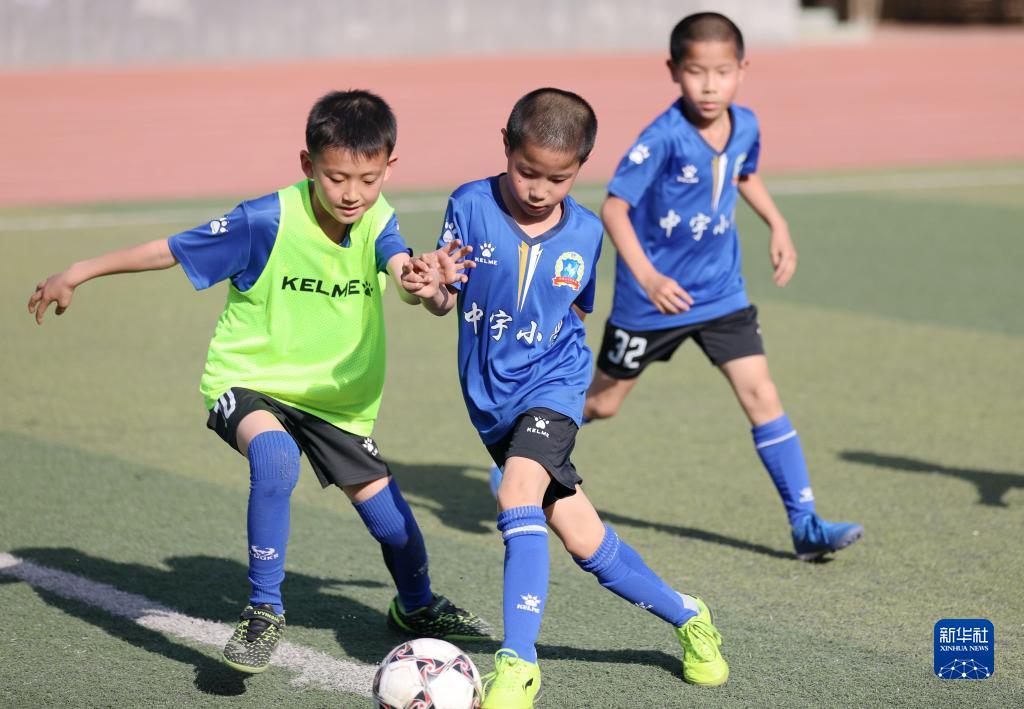 5月27日,臧昊喆(中)和臧昊宇(右)在课后参加足球训练。