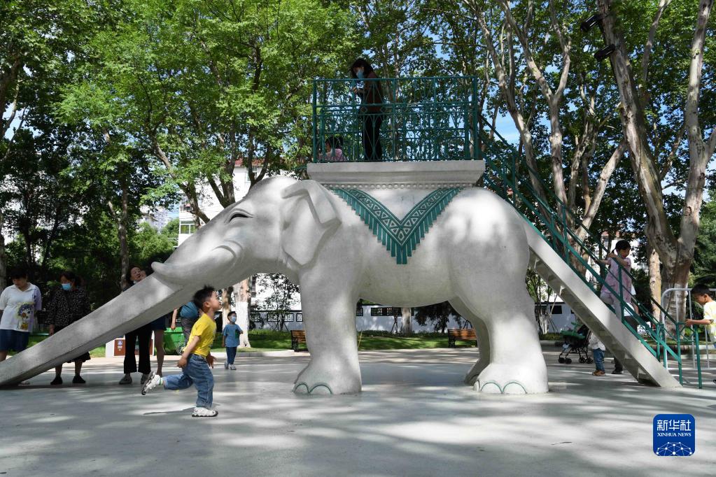 5月29日,一名小朋友在合肥市逍遥津公园准备坐大象滑滑梯。