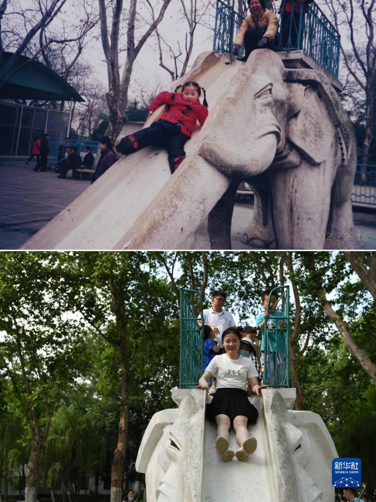 拼版照片:上图为2002年,5岁的杨秦媛在合肥市逍遥津公园坐大象滑滑梯(资料照片);下图为5月29日,杨秦媛在合肥市逍遥津公园坐大象滑滑梯(新华社记者 张端 摄)。