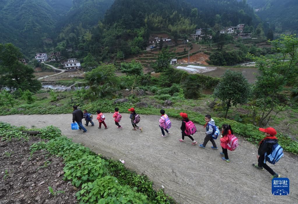 在广西全州县蕉江瑶族乡大源村苦马田教学点,学校唯一的老师卢加红中午放学后护送学生回家(2016年4月28日摄)。