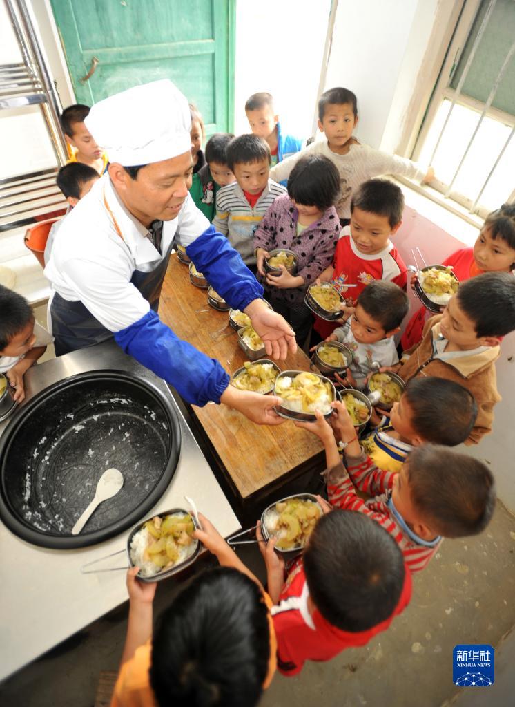 在广西上林县西燕镇大龙洞村大龙洞小学刁望教学点,学校唯一的老师石兰松在给学生打午饭(2013年5月7日摄)。