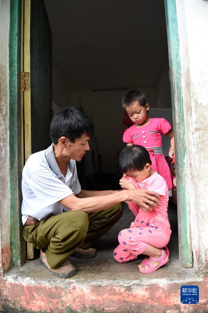 在广西东兰县三石镇泗爷小学,学校唯一的老师黄英雄在安慰一个因想家而哭泣的寄宿生(2014年9月10日摄)。