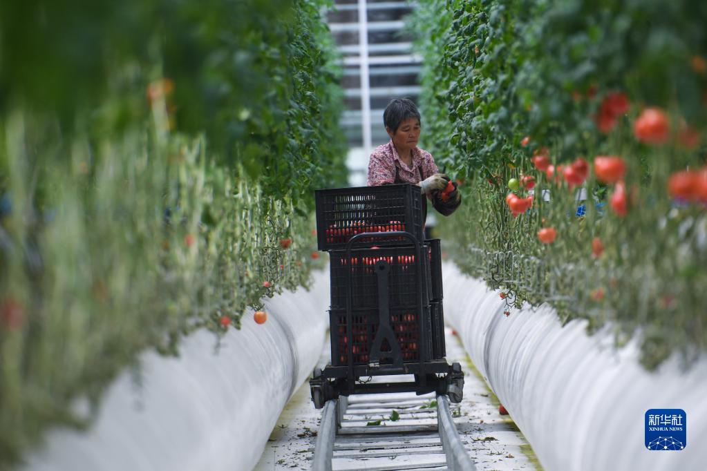 5月31日,在嘉兴市南湖区七星街道湘家荡农业数字化工厂的数字化大棚内,农民在采摘立体栽培的番茄。