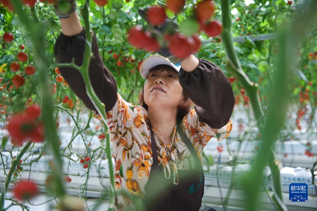 5月31日,在嘉兴市南湖区七星街道湘家荡农业数字化工厂的数字化大棚内,农民在采摘立体栽培的小番茄。