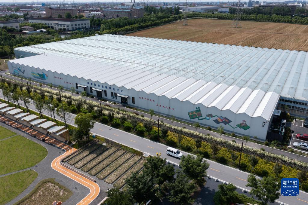 5月31日拍摄的嘉兴市南湖区七星街道湘家荡农业数字化工厂的数字化大棚(无人机照片)。湘家荡农业数字化工厂采用了精准水肥循环管理系统、智能环境控制系统、吊架立体栽培等管理方式和技术。