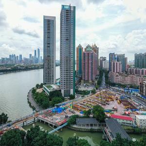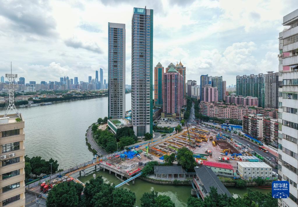 广州地铁10号线滨江东路站周边被珠江和高楼环绕,施工环境逼仄(5月31日摄,无人机照片)。