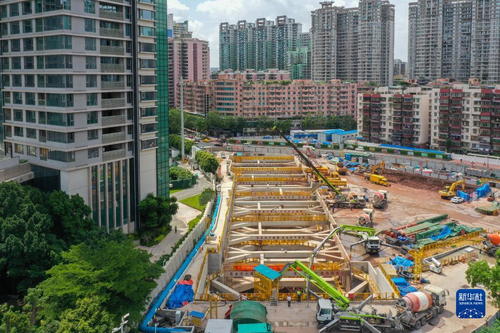 广州地铁10号线滨江东路站周边被珠江和高楼环绕,施工环境逼仄(5月31日摄,无人机照片)。