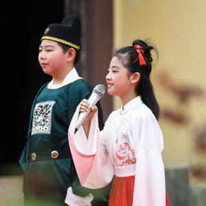 5月31日,在正兴镇河堰村,小朋友在文艺演出上进行诗朗诵。