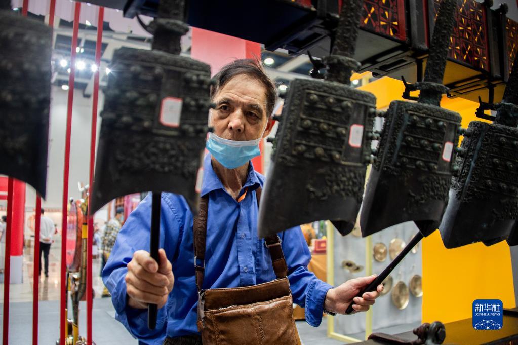 5月31日,参观者在活动现场体验编钟。