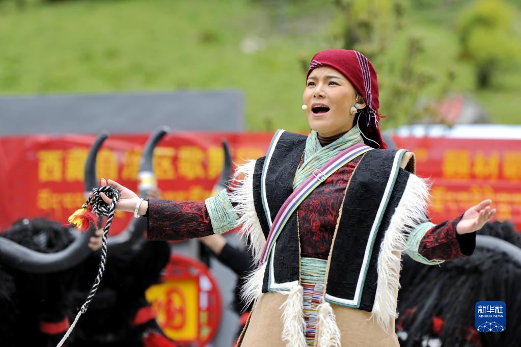 5月31日,演员在隆子县玉麦乡文化广场表演歌舞剧《天边格桑花》。