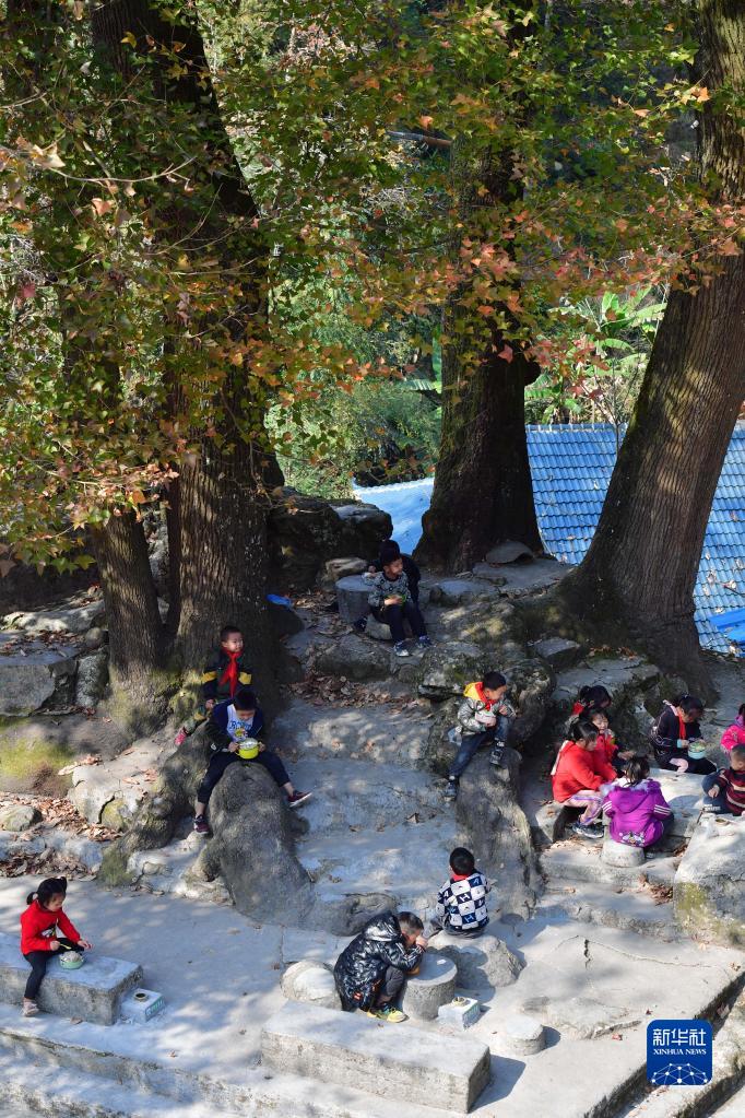 在乌英苗寨教学点,孩子们在冬日暖阳下吃营养午餐(2021年12月23日摄)。