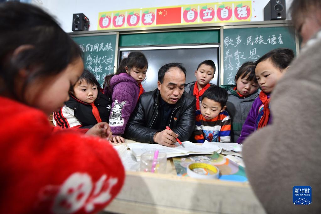 在乌英苗寨教学点,贵州籍老师潘先锋给孩子们辅导功课(2022年1月12日摄)。