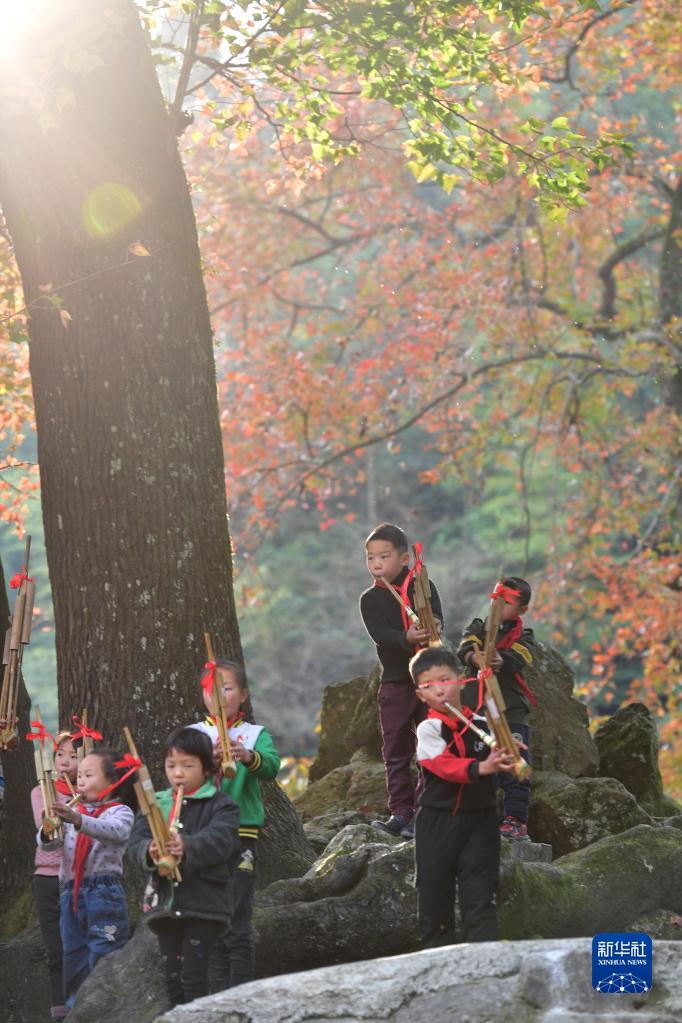 在乌英苗寨教学点“芦笙文化进校园”课堂上,孩子们在练习吹芦笙(2021年12月14日摄)。