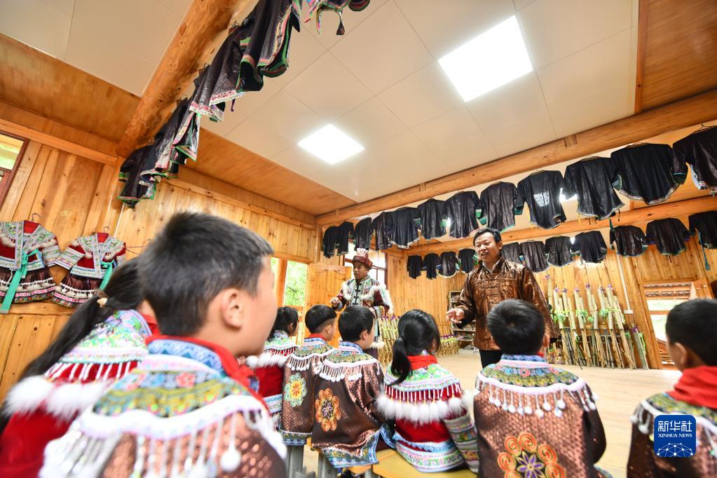 在乌英苗寨教学点“苗歌文化进校园”课堂上,孩子们在学唱苗歌(2022年5月31日摄)。