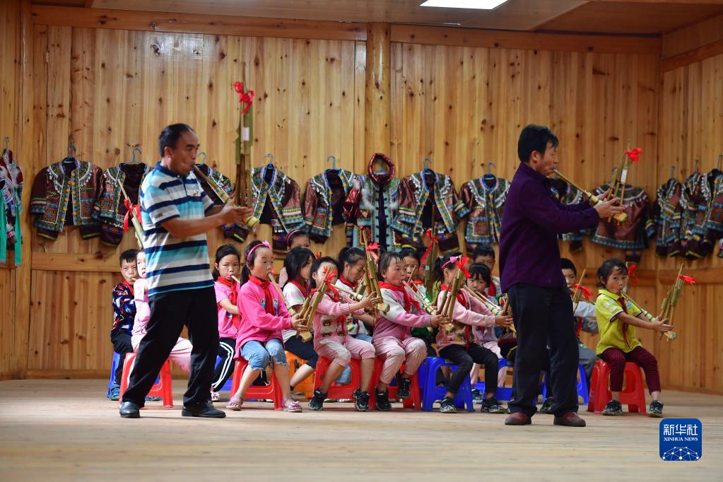 在乌英苗寨教学点“芦笙文化进校园”课堂上,贵州籍老师潘先锋(前左一)、广西籍老师蒙林安(前左二)在教孩子们吹芦笙(2021年6月3日摄)。